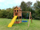 Детский городок Выше Всех Новая Победа 2 понравится и детям, и взрослым. Помимо классических элементов, таких как качели и горка, мы добавили модуль с турником. Веселье и спорт вместе - что может быть лучше! Дополнительное преимущество модели - возможность расположить модули с учетом вашего участка и желания.