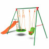 Игровой комплекс MSS-02 серии DFC Kids поможет привить ребенку любовь к активному отдыху с первых лет жизни — непоседа будет в восторге от такого количества развлечений и сможет пригласить друзей, а родители — отвлечься от ежедневной рутины. А если ребенок устанет — не беда, ведь он сможет прилечь не отходя от комплекса, в уютные качели-гнездо. За счет большого разнообразия развлечений, комплекс, являющийся полноценной игровой площадкой, отличается крупными габаритами — 322×188×196 см, при этом играть на нем могут не больше 5 детей весом до 35 кг. В состав комплекса входят веревочные качели 2 типов (классические и «гнездо») и волнистая горка из ABS пластика, который не выцветает на солнце и не подвержен влиянию влаги. Безопасность комплекса обеспечивается крепкими стальными опорами, изготовленными из профиля 45×1,5 мм, и прочными полиэтиленовыми канатами с возможностью регулирования высоты качелей; горка изготовлена из гипоаллергенного ABS пластика, не вызывающего кожной реакции, и оборудована высокими бортиками, благодаря которым ребенок не выпадет во время катаний. Комплекс подходит для детей от 3 лет и выдерживает нагрузку до 175 кг. В комплекте с комплексом поставляются анкеры крепления к земле, повышающие устойчивость конструкции. Под каждый анкер выкопайте яму глубиной 60 см и залейте бетонным раствором 30x30x50 см (ДxШxВ). Воткните анкеры в раствор, пока он не застыл.
